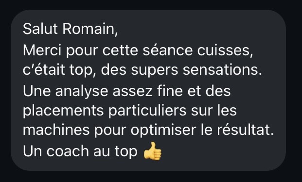 "Très bon suivi personnel avec une assiduité qui va avec. Programme adapté et en accord avec les objectifs. Professionnalisme, réactivité et disponibilité. Romain connait sont travail, il sait de quoi il parle et c'est rassurant."